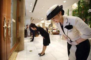 Atendentes de loja que se curvam ao receber e despedir-se dos clientes.