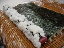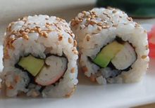 (enrolado ao contrario). 裏巻き. Um pedaço cilíndrico médio, com dois ou mais recheios. Uramaki se diferencia dos outros maki porque o arroz está na parte externa e o nori na interna. O recheio fica no centro, rodeada por uma camada de nori, então uma camada de arroz e uma cobertura de outro ingrediente como ovas de peixe ou sementes de gergelim torradas. Tem como seu mais popular representante um sushi americano, o California Roll.